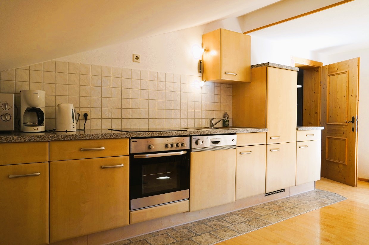 • Wohnküche mit Esstisch, (Schlaf-) Sofa, Sat-TV, komplette Geschirrausstattung, Kühlschrank, Geschirrspülmaschine, Elektroherd mit Backrohr, Kaffeemaschine & Wasserkocher, Mikrowelle